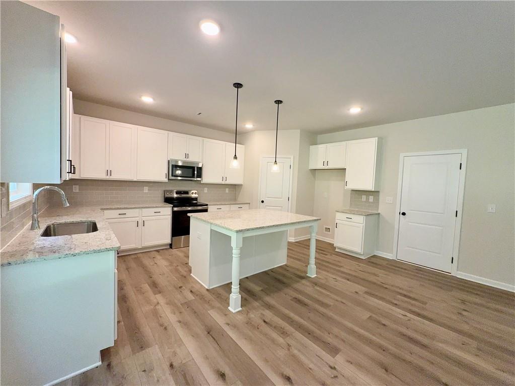 Luxury vinyl plank flooring runs throughout the main living spaces, adding durability and ease of maintenance. The Kitchen features a large island, stainless steel appliances, white cabinets, granite counters, tile backsplash, and a pantry designed to support both daily routines and hosting needs.